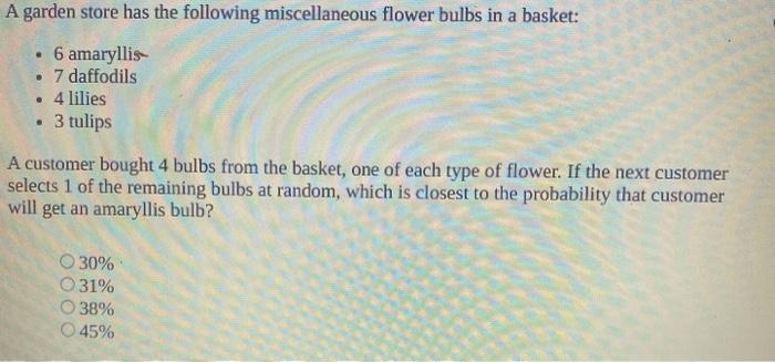 A garden store has the following miscellaneous bulbs in a basket: 6) a garden store has the following miscellaneous flower bulbs in a basket. If they do, treat the sprouts gingerly. If the next customer selects 1 of the. 36% 27% 29% 21% 2. Spring bulbs start to grow again in the fall and flower the following growing season. If the next customer selectsc1 of the remaining bulbs at random, which is closest to the probability that customer will get an amaryllis bulb Bulbs can be broken down into five types of storage structures. If the next customer selects 1 of the. 6 amaryllis 7 daffodils 4 lilies 3 tulips a customer bought 4 bulbs from the basket, one of each type of flower. Many varieties of bulbs will not produce flowers a second year in southern climates. 5 amaryllis 6 daffodils 4 lilies 3 tulips a customer bought 4 bulbs. A garden store has the following miscellaneous flower bulbs in a basket: